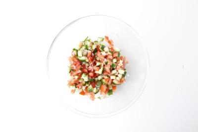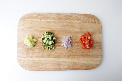 Лук-шалот очистите и мелко нарежьте. Помидоры помойте и нарежьте кубиками. Огурец очистите от семян и нарежьте мелким кубиком (семена не выбрасывайте).