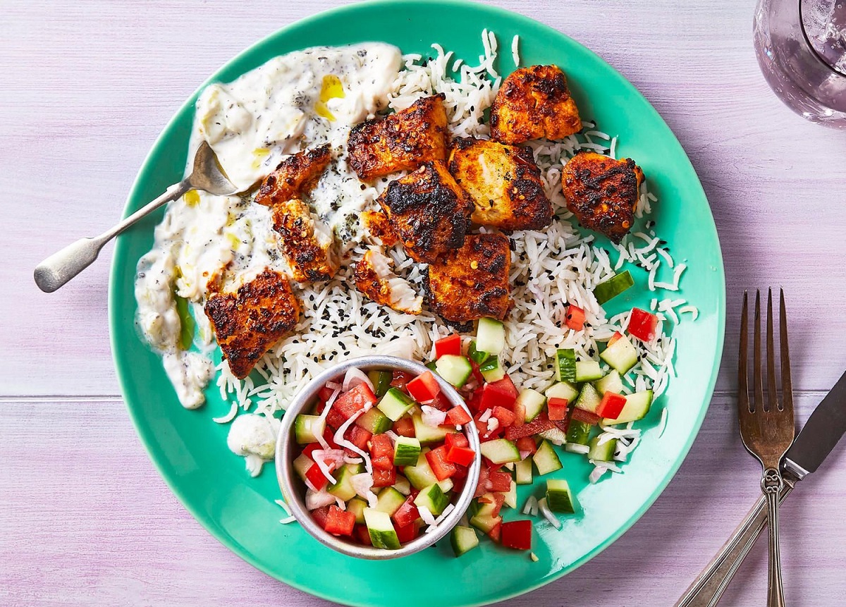 Для подачи выложите на тарелку рис, сверху кусочки рыбы, подавайте с овощной сальсой и мятно-огуречным соусом.