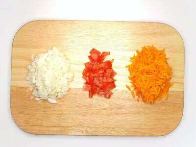 Репчатый лук мелко нарежьте. Помидор нарежьте на кубики. Морковь почистите и натрите на терке.