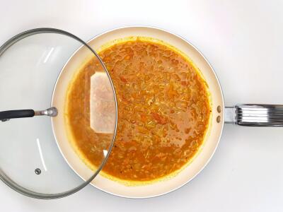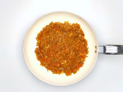 На среднем огне нагрейте большую антипригарную сковороду с кусочком сливочного масла. Когда масло разойдется, поместите в сковороду измельченные лук, морковь, помидор и имбирно-чесночную пасту. Готовьте 4-5 минут, помешивая. Затем добавьте приправу Рас-Эль-Ханут, перемешайте и жарьте еще 1-2 минуты до появления аромата.