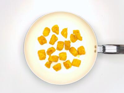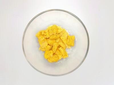 Филе пангасиуса промойте, промокните бумажным полотенцем и нарежьте на средние кусочки. В глубокой миске смешайте кукурузную муку, куркуму, щепотку соли и перца. Поместите кусочки пангасиуса в миску, перемешайте, чтобы рыба вся была покрыта мукой и специями.