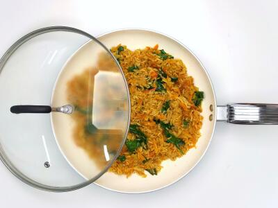 В сковороду к овощам добавьте рис, влейте овощной бульон, выдавите сок половины лайма, посолите и поперчите. Тщательно размешайте, доведите до кипения на сильном огне. Когда смесь закипит, убавьте огонь до минимального, накройте крышкой и готовьте 12-15 минут, пока рис не впитает всю жидкость. Периодически помешивайте.