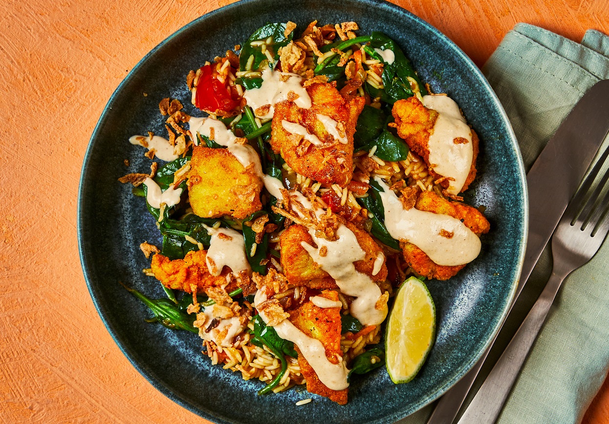 Подавайте кусочки пангасиуса с рисом. Сбрызните соусом тахини и украсьте долькой лайма и хрустящим луком фри.