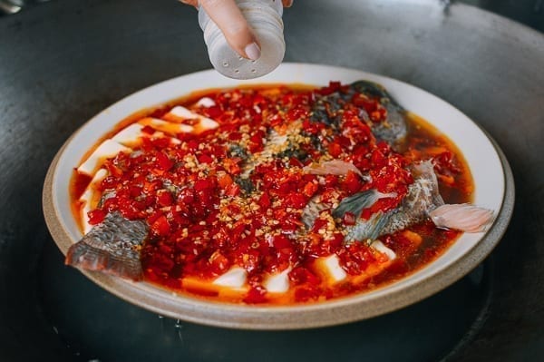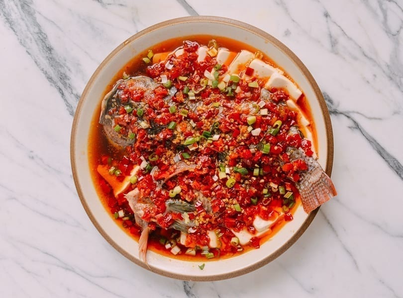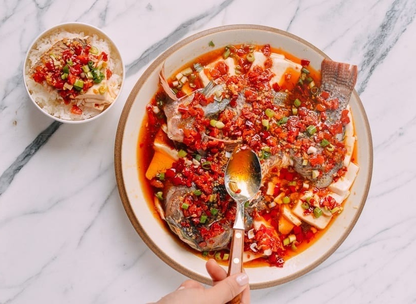 Тилапия на пару с тофу и маринованным перцем чили — это классическое блюдо из цельной рыбы из китайской провинции Хунань. В нем очень необычно сочетаются смелые и нежные вкусы и текстуры. Это отличный вариант для праздничного обеда или ужина.