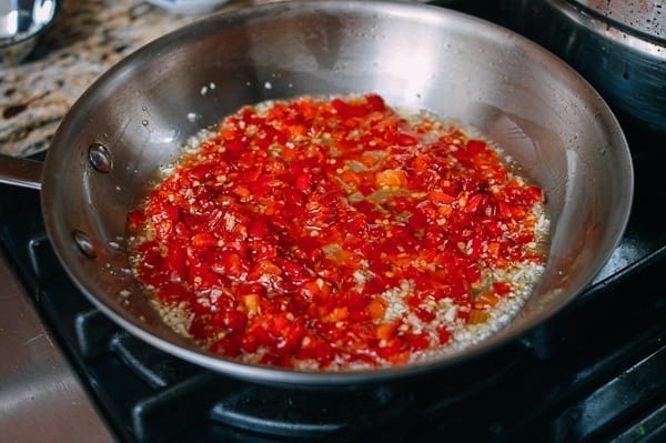 Дайте имбирю и перцу настояться в масле в течение 1-2 минут. Масло должно стать красным и ароматным.
