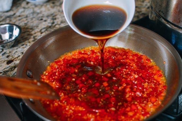 Затем добавьте измельченный чеснок и порезанную белую часть лука. Помешивайте еще 10 секунд и добавьте горячую воду, соевый соус, сахар и молотый перец.