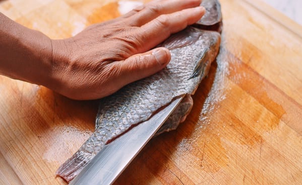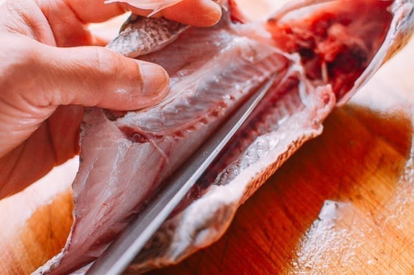 Сначала подготовьте рыбу. Выпотрошите её, обрежьте острые плавники, жабры и удалите чешую. При помощи ножа удалите крупные участки кровеносной системы (красного цвета) с внутренней полости рыбы.