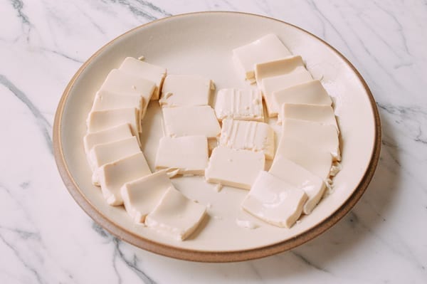 Разрежьте тофу на ломтики толщиной примерно по 0,5-1 см. Переложите нарезанный тофу на большую жаропрочную тарелку. Она должна быть достаточно глубокой, чтобы вместить жидкость при приготовлении на пару и соус. Положите тофу на блюдо так, чтобы кусочки располагались веером по обе стороны. Посолите щепоткой соли.