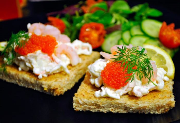- с зерновым хлебом. На порционный кусочек хлеба мажем мягкий сыр (филадельфия, буко), следом распределяем икорную массу, закрепляем листом салата и долькой лимона. Вместо сыра можно использовать горчицу, соус тартар, соус для сэндвичей и даже обычный майонез.