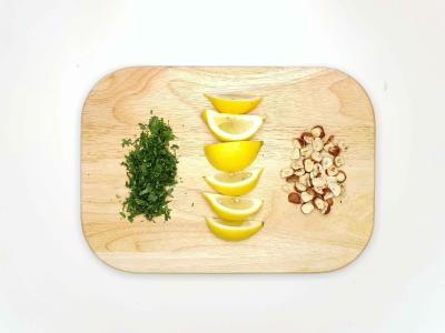 Подсушите фундук в духовке на противне при 180 градусах в течение 3-5 минут. Петрушку вместе со стеблями мелко порубите. Лимон разрежьте на четвертинки. Остывшие орехи порубите ножом. Гребешки промойте и обсушите.