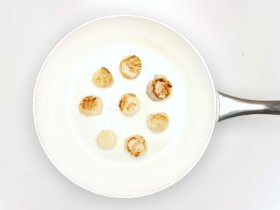 На сильном огне нагрейте сковороду с растительным маслом. Выложите гребешки и жарьте 2 минуты, затем переверните и жарьте еще минуту до готовности (гребешки станут непрозрачными).