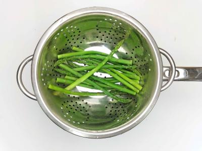 Обрежьте концы у спаржи. Вскипятите воду с щепоткой соли, варите в ней спаржу 3-4 минуты на сильном огне, потом слейте воду.