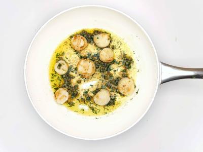 Уберите гребешки со сковороды, верните ее на средний огонь с кусочком сливочного масла. Держите масло на огне 2-3 минуты, потом добавьте петрушку, каперсы и сок четверти лимона. Верните гребешки в соус и готовьте минуту.
