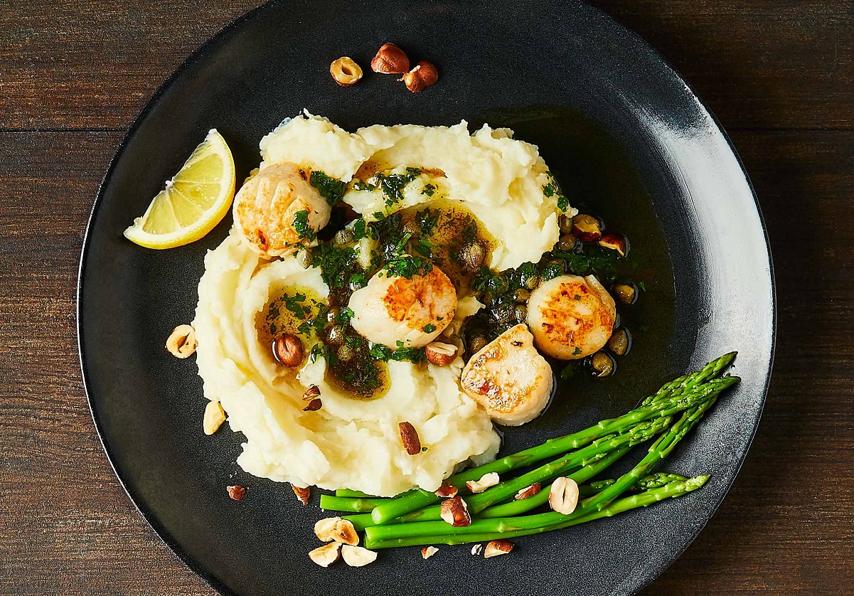 Приготовьте изысканное ароматное блюдо во французском стиле. Обжарьте морские гребешки в масляном соусе с петрушкой и каперсами. Сварите к ним нежное картофельное пюре со сливками. Не забудьте отварить хрустящую яркую спаржу на гарнир.