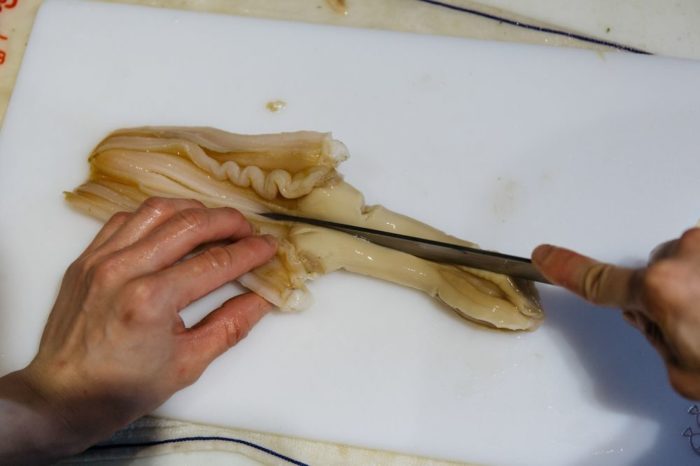 окунаем моллюска на несколько секунд в кипяток, а затем в ледяную воду. Делаем надрез возле живота. Снимаем кожуру