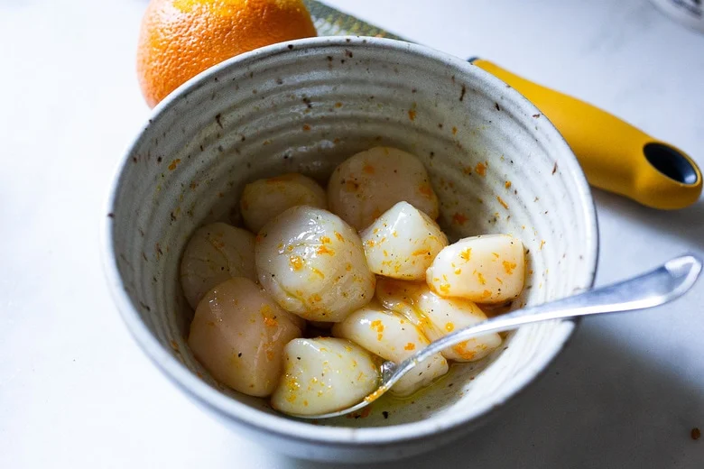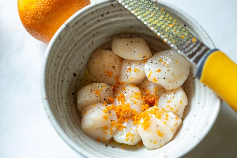 Тщательно обсушите гребешки бумажными полотенцами и положите в глубокую миску. Смажьте их оливковым маслом, чтобы они были покрыты им со всех сторон. Добавьте по щепотке соли и перца, цедру, мелко порезанный чеснок и кориандр (по желанию). Аккуратно перемешайте и дайте постоять 15 минут.