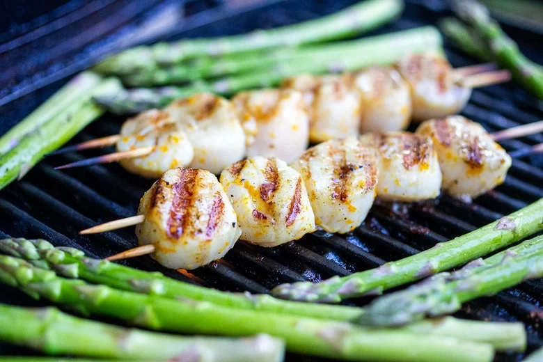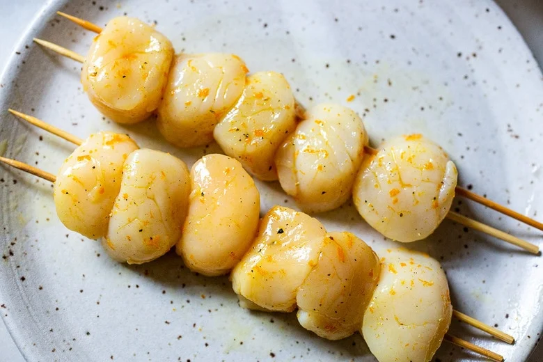 Пока маринуются гребешки, разогрейте гриль (или мангал) до средне-высокого жара. Если вы используете деревянные шпажки, положите их в воду, так они не обуглятся и не сгорят.