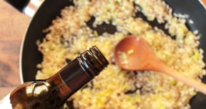 - Вылить вино. После его испарения доливать порционно бульон до готовности.