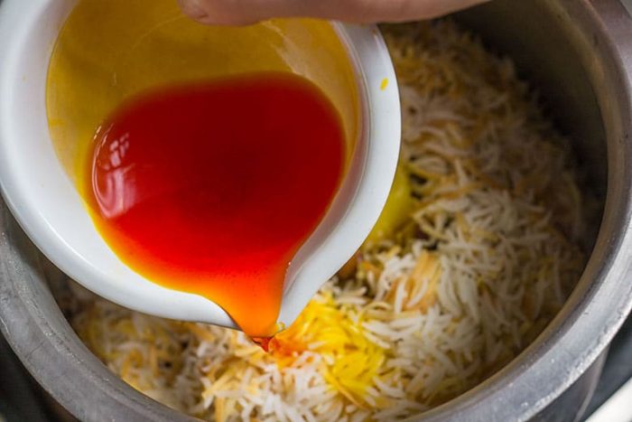 Добавляем в сковороду шафрановую воду, соль и приправы. Заливаем всё кипятком так, чтобы уровень воды был выше риса примерно на палец.
