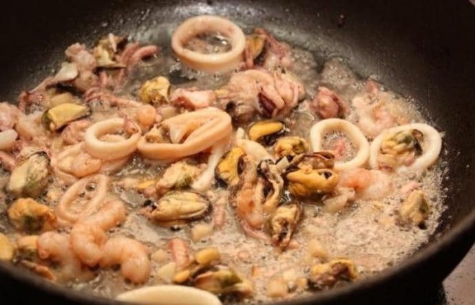 - В сковороду добавить кольца кальмаров и жарить до золотистой корочки. Затем выложить мидии и тушить несколько минут.
