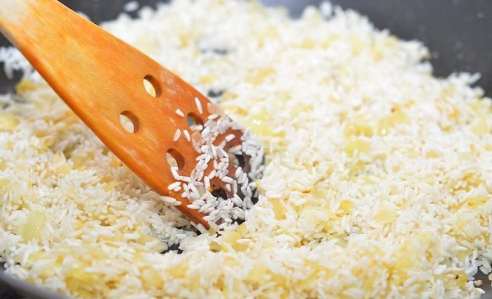 - Содержимое сковороды залить вином и куриным бульоном. После закипания добавить подготовленный рис.