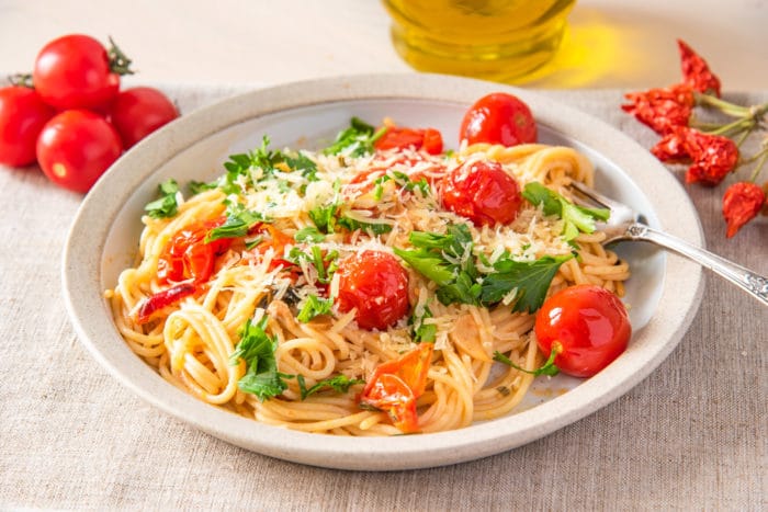 Перед тем, как подавать такую лапшу с помидорами, лучше всего посыпать ее сверху российским или любым другим сыром, как предлагает рецепт.