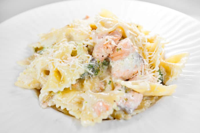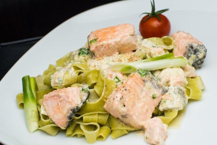 - Отварите спагетти. Можно выбрать с названием фетучини. С семгой они получаются особенно вкусными. Останется только выложить овощи с рыбой на тарелку, как этого требует рецепт.