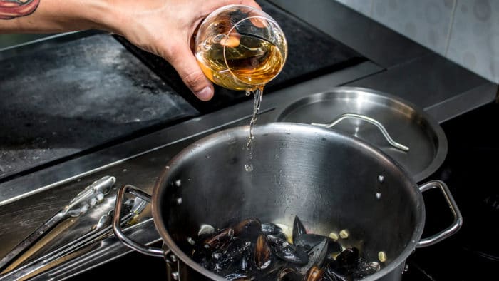 - Далее черед бульона. Лучше всего взять куриный. Влив его к моллюскам с вином, варить 5 минут;