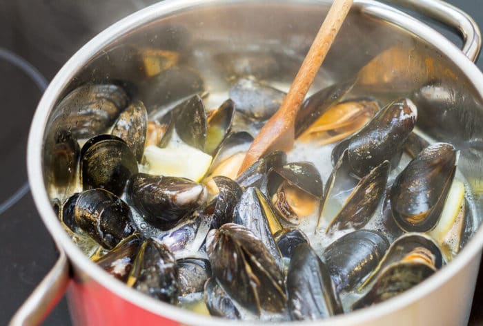 Поставить кастрюлю на огонь. После закипания дать моллюскам поварится до 5 минут. В это время важно периодически потряхивать емкость, чтобы все ракушки смогли раскрыться в створках;