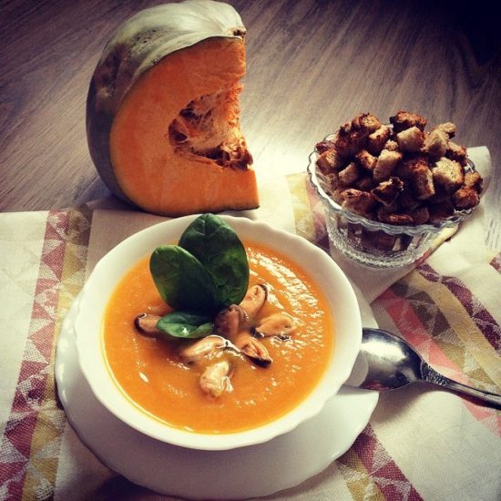 С помощью блендера взбить тыкву в пюре и вновь поставить на огонь. Добавить сливки, приправить солью и перцем. Ввести мидии и дать закипеть