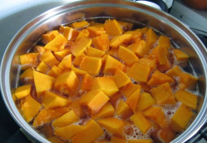 Положить в кастрюлю нарезанную кубиками тыкву, лук и чеснок. Залить бульоном от варки морепродуктов и проварить пять минут.