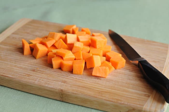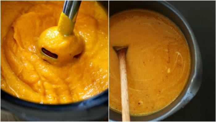 - Картофель и морковь сварить в небольшом количестве подсоленной воды. Взблендерить вместе с оставшейся жидкостью;