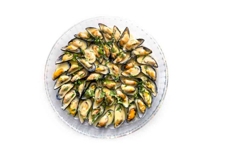 - Подержать мидии в сливочно-чесночном соусе под стеклянной крышкой 10 минут и выложить на порционные тарелки.