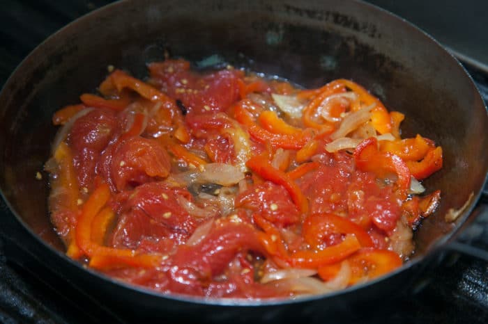 - Добавить к ним обжаренные чеснок и перец, томаты.