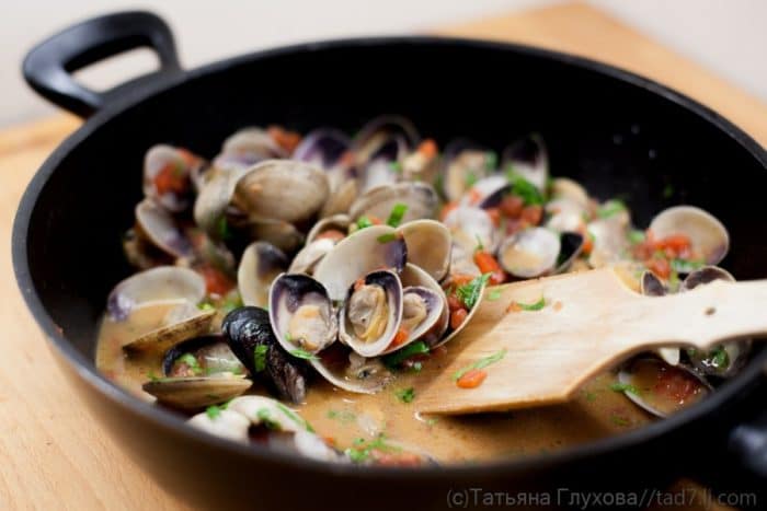 - Готовить на небольшом огне до тех пор, пока ракушки не раскроются.
