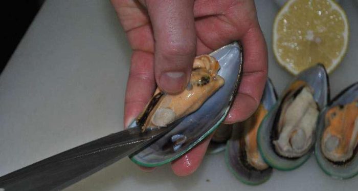- В половинках ракушки срежьте мясо у зеленых моллюсков. Раковины уберите в сторону, не выбрасывайте.