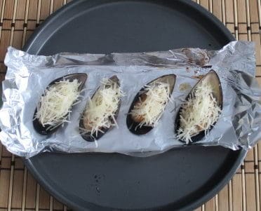Сложите все обратно в раковину. Обильно смазать внутренность створки соусом так, чтобы все мясо было им укрыто. Половинки нужно посыпать тертым сыром, а затем черным кунжутом украсить мидию.