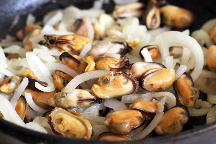 - Добавить моллюски и грибы одновременно, тушить, пока не выпарится весь сок.