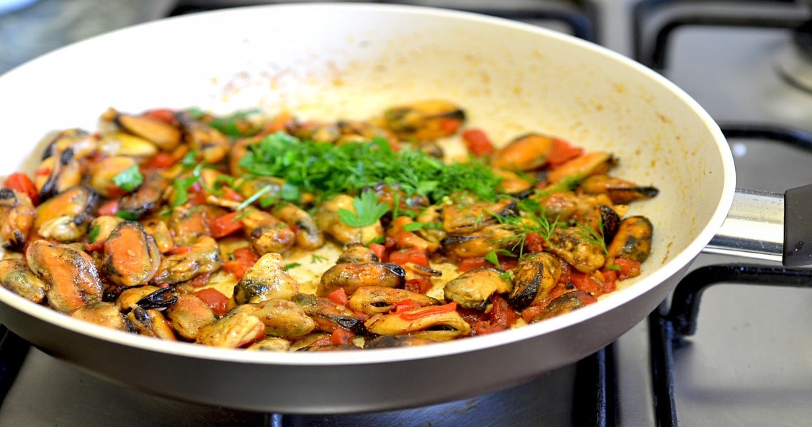 Мидии, жаренные на сковороде, с чесноком кажутся очень странным сочетанием острой пряности с нежным вкусом морепродуктов. Но они образуют вполне удачный тандем.