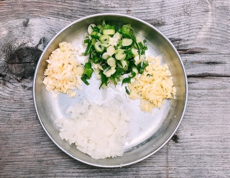 Подготовьте ингредиенты. Мелко порежьте белый и зеленый лук, имбирь (нужно примерно 2 чайные ложки) и чеснок.