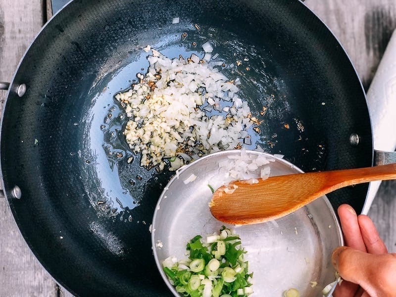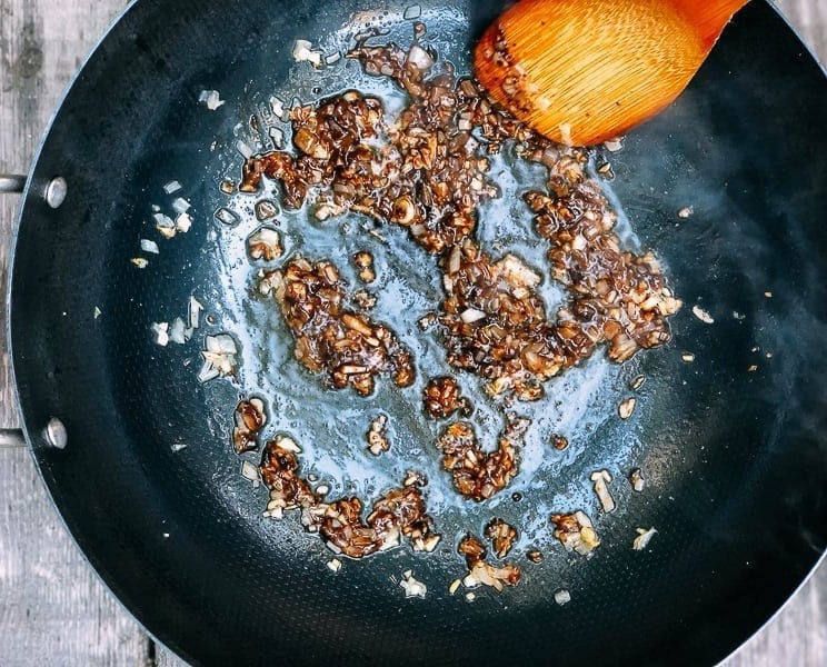 Разогрейте вок или сковороду (только не с антипригарным покрытием) на среднем огне. Добавьте растительное масло и измельченный имбирь. Помешивайте его в течение 10 секунд, чтобы масло настоялось, затем добавьте чеснок, белый лук, измельченную фасоль и чесночный соус (из банки с фасолью или взятый отдельно, см. пункт после рецепта).