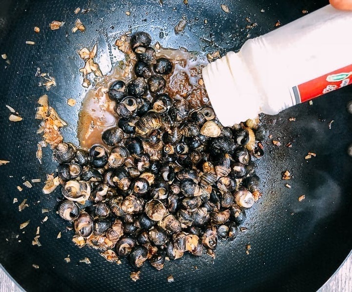 Добавьте улиток. Поднимите огонь до максимума и помешивайте улиток в течение 10 секунд. Добавьте вино. Продолжайте помешивать на сильном огне еще 15 секунд, затем добавьте кунжутное масло, сахар, светлый и темный соевый соус. Перемешайте и накройте вок крышкой.