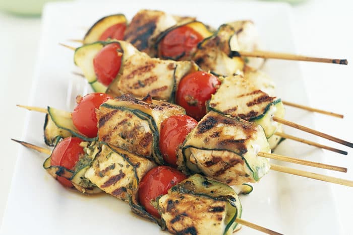 - Заранее разогретый гриль обрабатывается тонким слоем растительного или оливкового масла, после чего на него помещаются шампуры.
