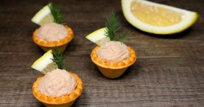 - Выложить в тарталетки, украсить зеленью.