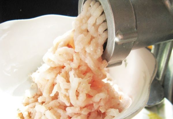 - Мясо щуки перекручиваем на мясорубке с салом и луком, солим. Для аромата в рыбный фарш добавляется мелко рубленый укроп.