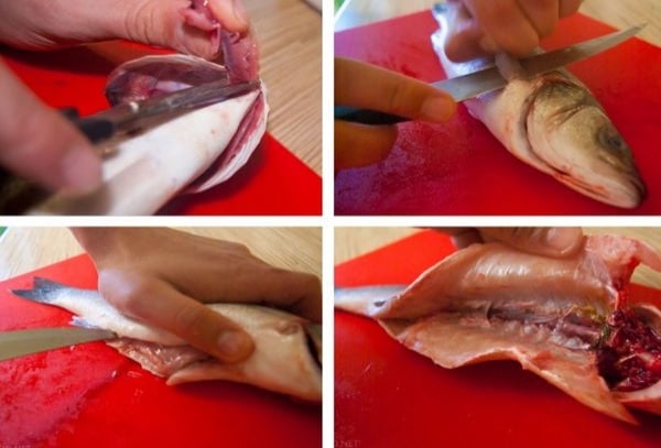 - Вспорите брюхо рыбы по направлению к хвосту от основания головы.