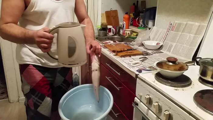 После этого необходимо будет достать рыбу, охладить ее под ледяной водой. Важно следить за рыбой, и ни в коем случае не передержать ее в кипятке, поскольку в противном случае может свариться кожа. Тогда, чешую можно будет снять исключительно с ней вместе.