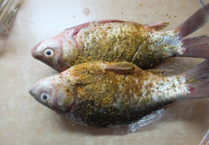 - Тушки натереть с двух сторон специями, оставить минут на 20 в сторону, чтобы караси пропитались. Сделать небольшие надрезы вдоль всей тушки.