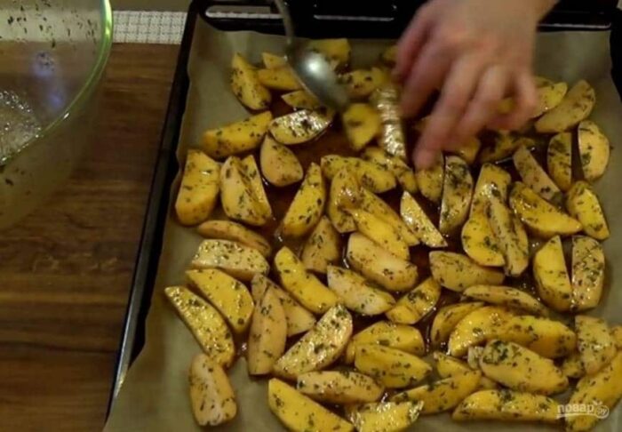 Взять форму для запекания. Противень будет нелишним застелить пергаментной бумаге. На форму налить растительное масло и сверху выложить нарезанную картошку. Картошку посолить, добавить сверху приправ.