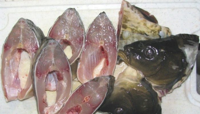 - При помощи острого ножа следует отрезать голову и плавники.